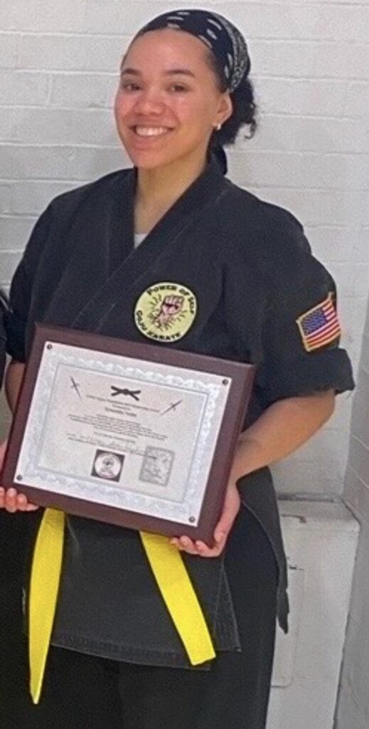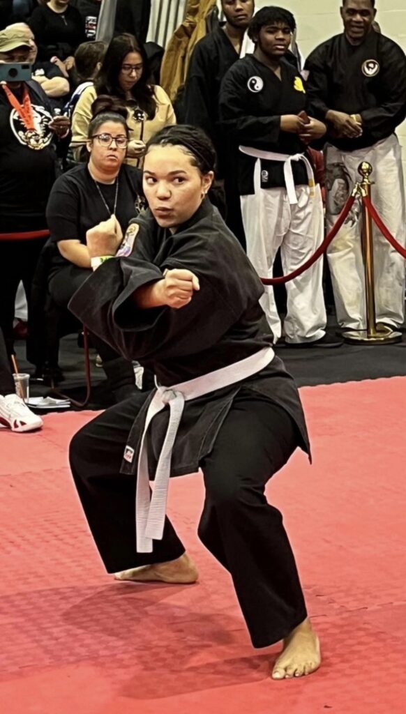 Symantha trains simultaneously in two styles of karate, Goju and Isshin Ryu, and is a fierce first place tournament competitor.
